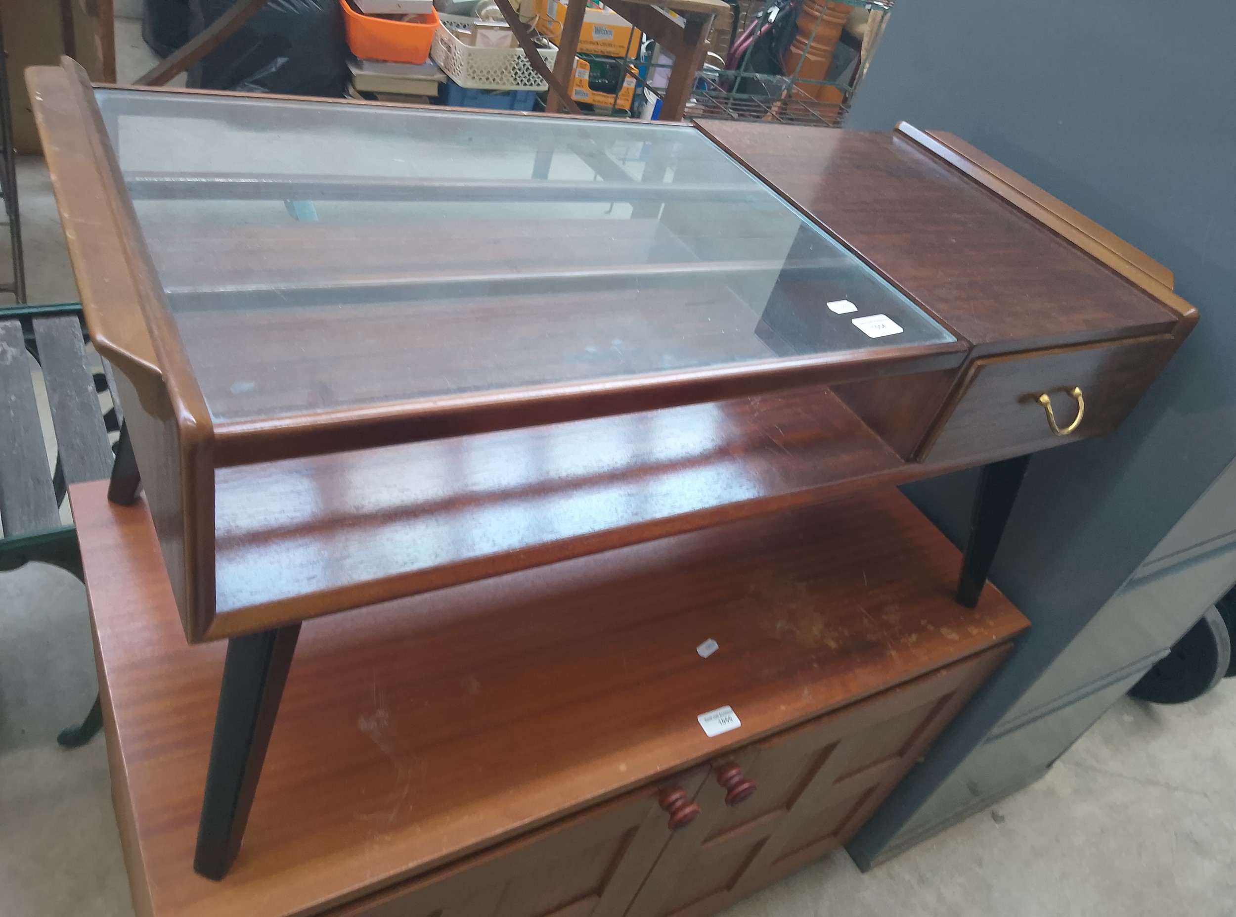 This is a two-tiered wooden table featuring a glass-covered section, a solid wood section with a drawer, and a lower wooden surface with knobs.