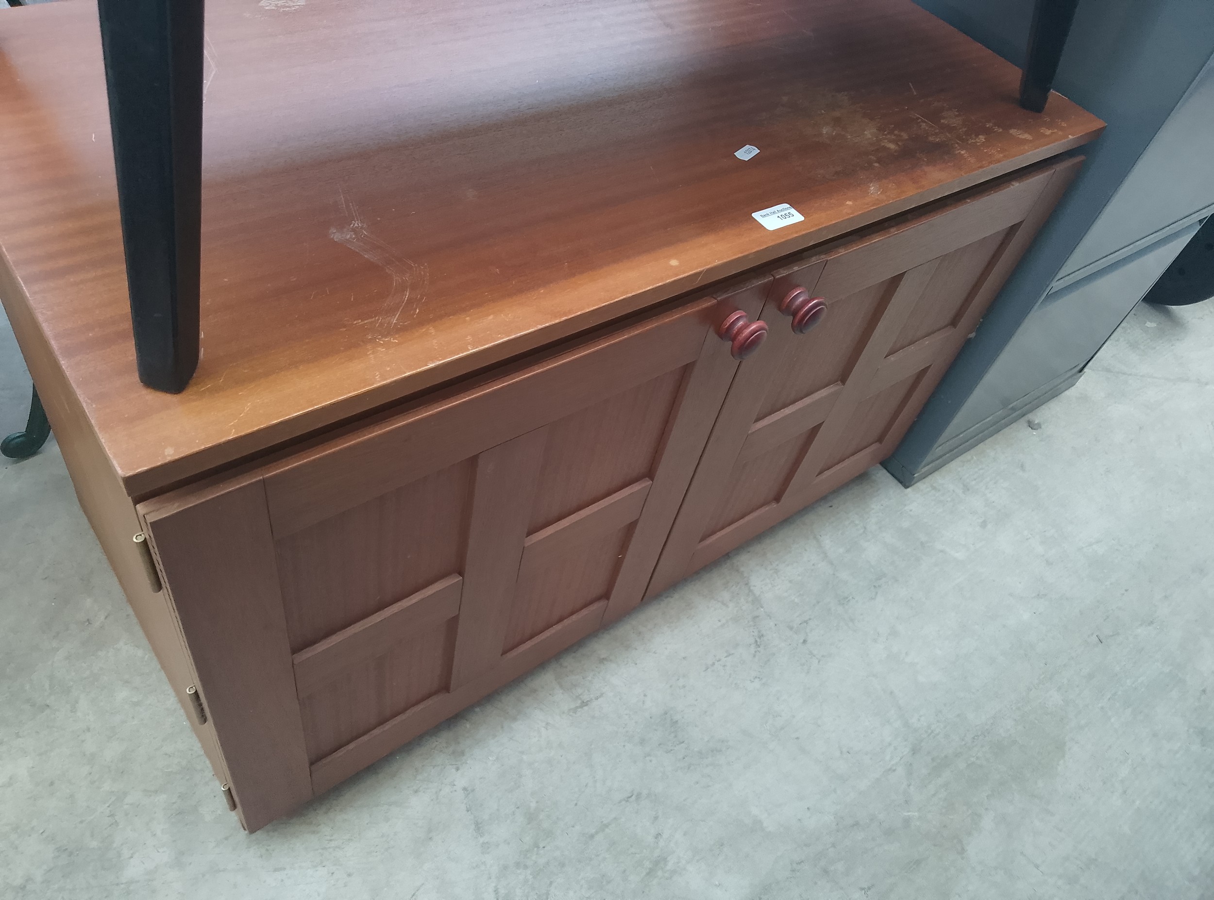 This is a rectangular wooden cabinet featuring a light brown wood top and a darker reddish-brown wood front with two paneled doors, each with a red knob.