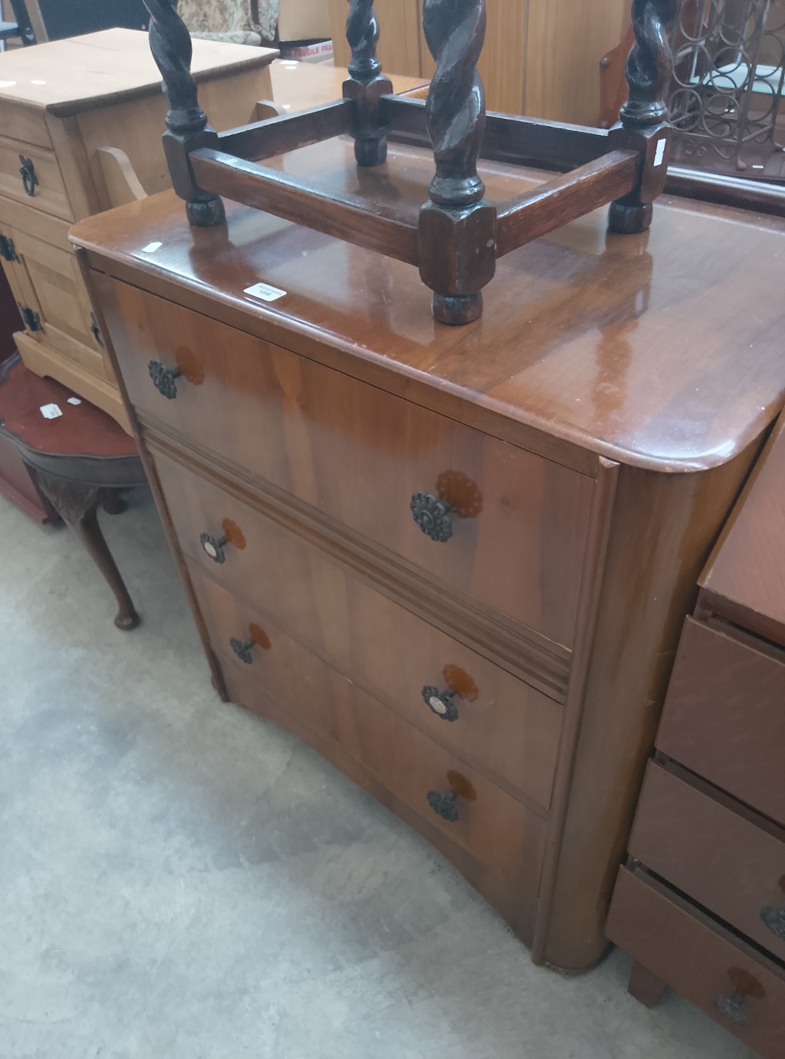This is a wooden dresser with a reddish-brown finish, featuring three drawers with ornate dark metal pulls and a curved front.