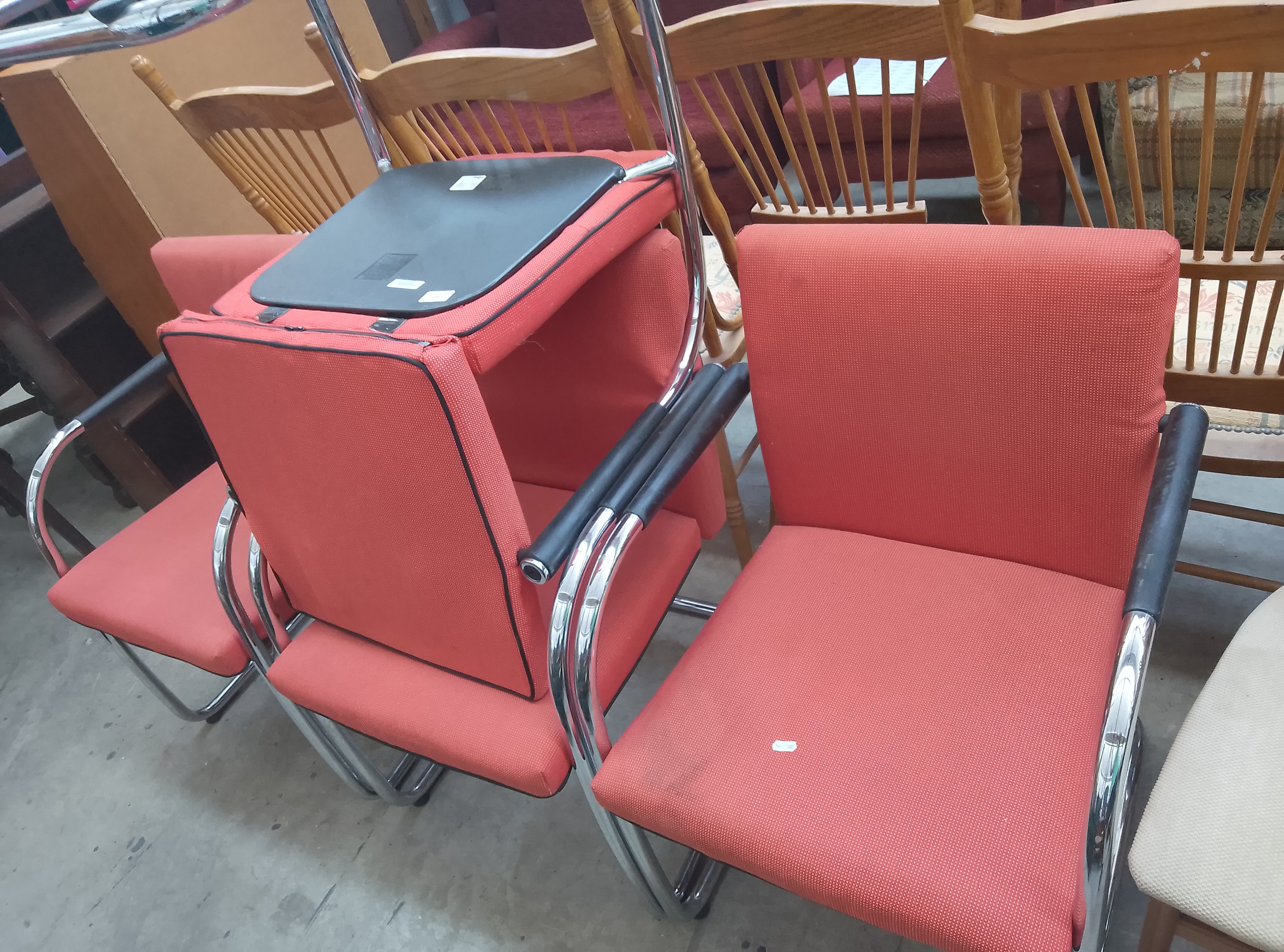 This listing features a pair of modern chairs with coral-colored fabric upholstery and chrome-plated metal frames, including curved legs that form armrests.