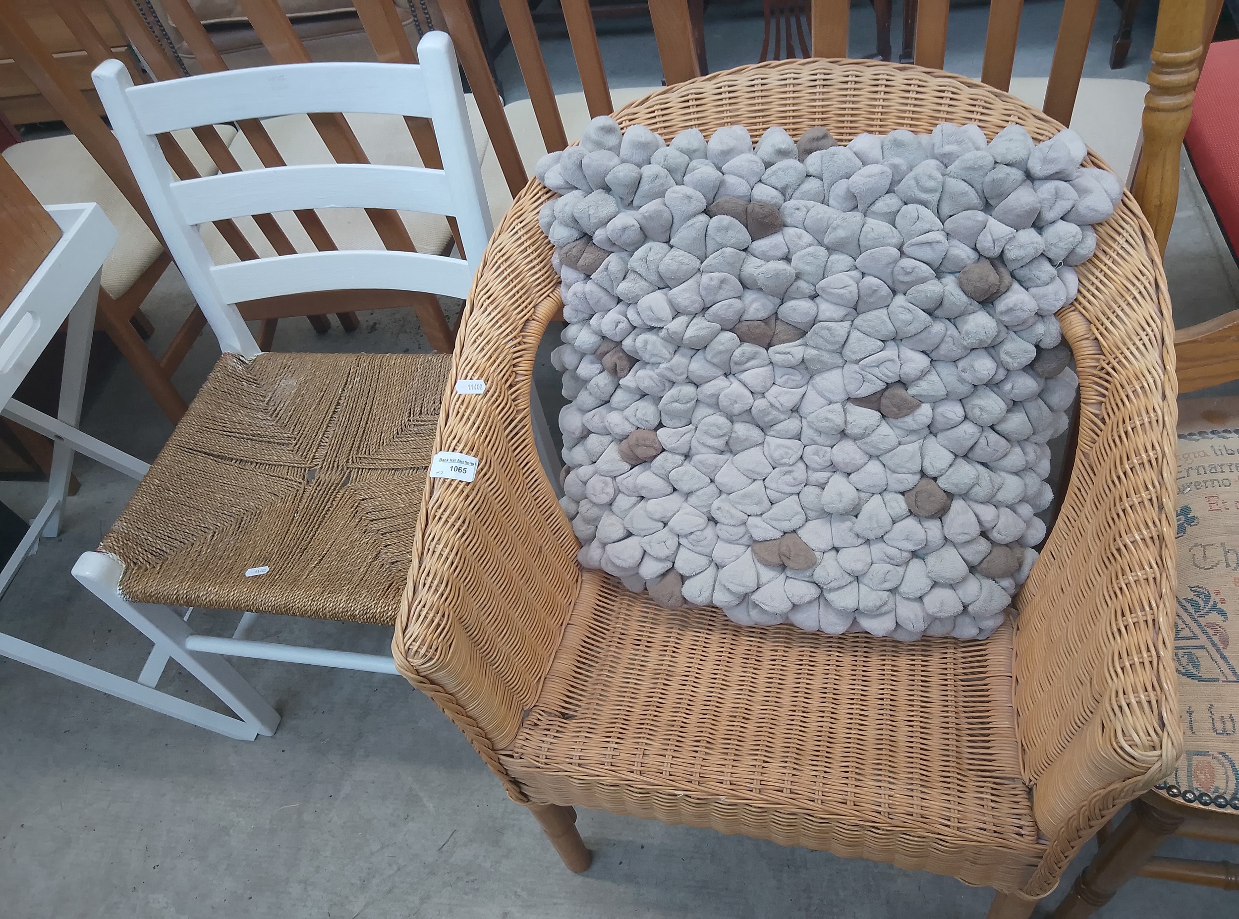 A light brown wicker armchair with a rounded back and arms, featuring a textured cushion made of small grey and taupe fabric pieces.