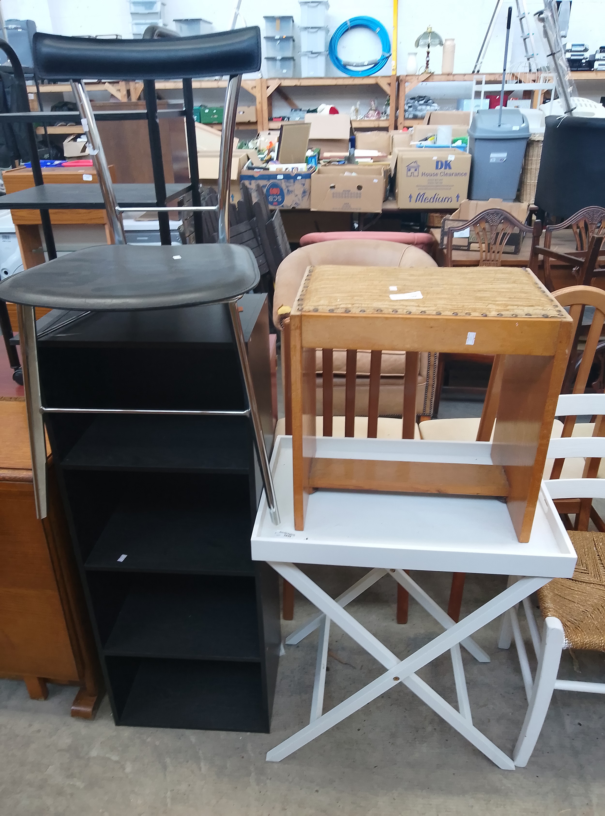 A black three-shelf bookcase with metal supports, a wooden stool with a woven seat, and a white tray table.