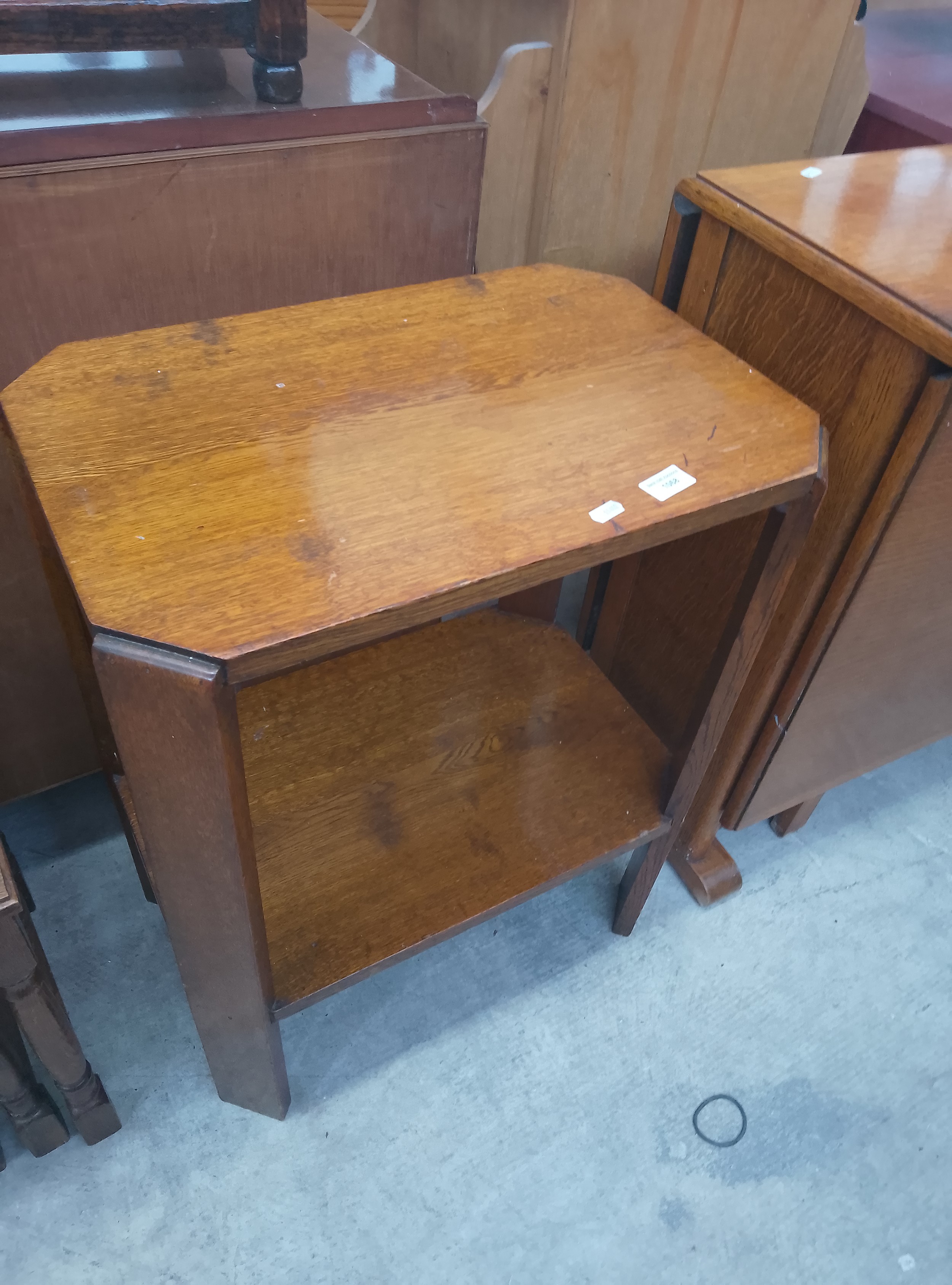 An octagonal wooden side table with a lower shelf, featuring a medium brown stain and glossy finish.