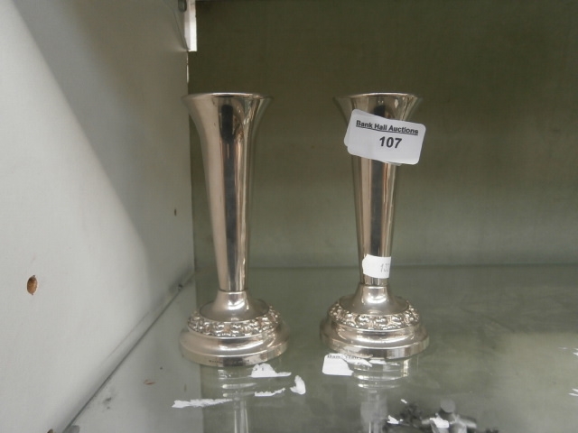 A pair of silver-toned metal vases with trumpet-shaped openings and footed bases featuring embossed floral patterns.