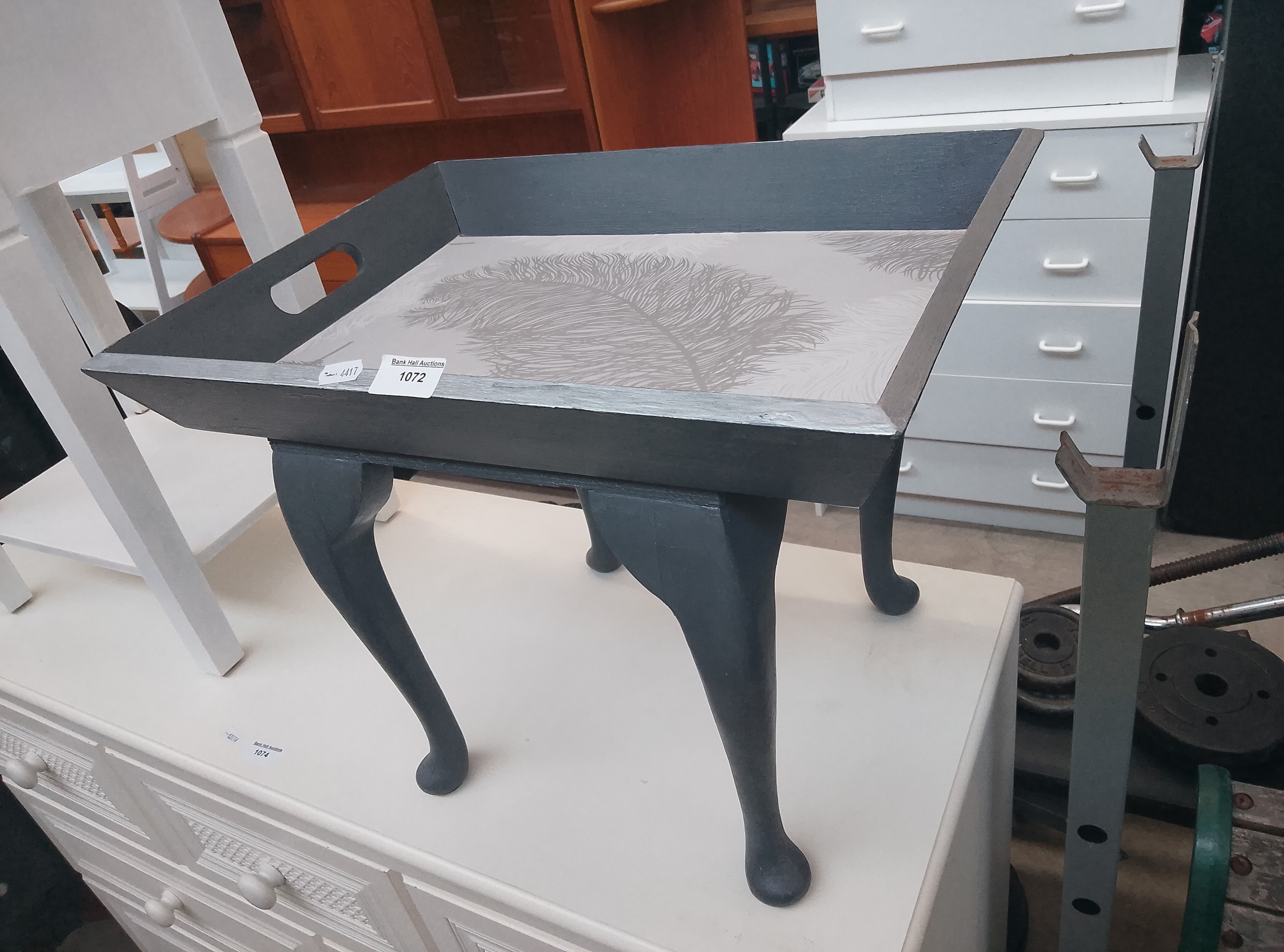 A dark gray tray with four cabriole legs, cut-out handles, and a feather pattern interior, trimmed with silver-colored material.