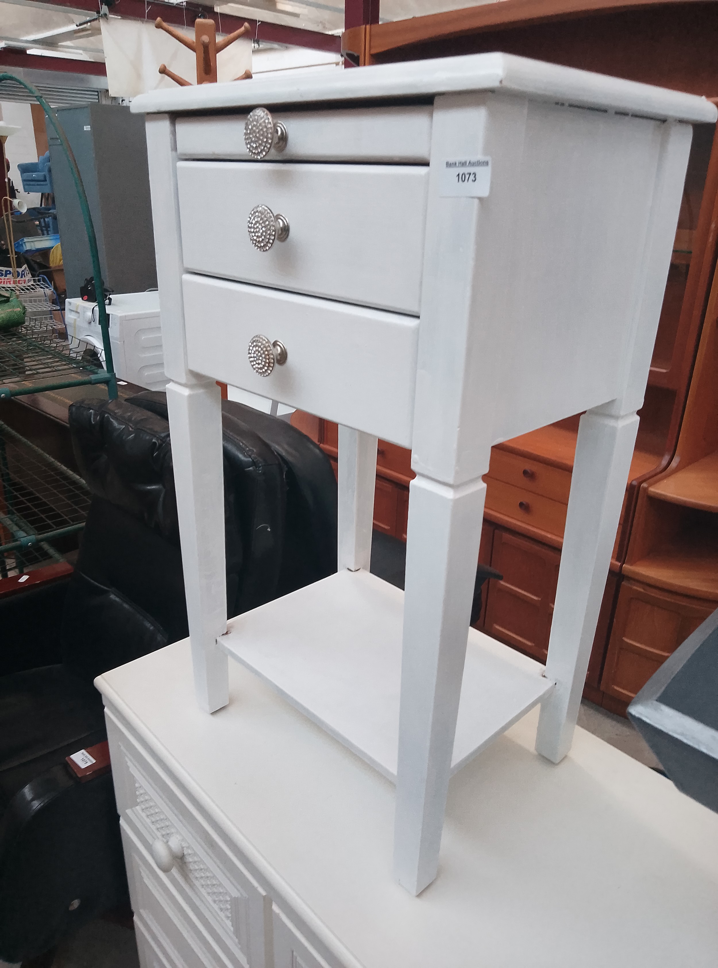 A white three-drawer nightstand featuring a lower shelf and round, faceted drawer knobs.