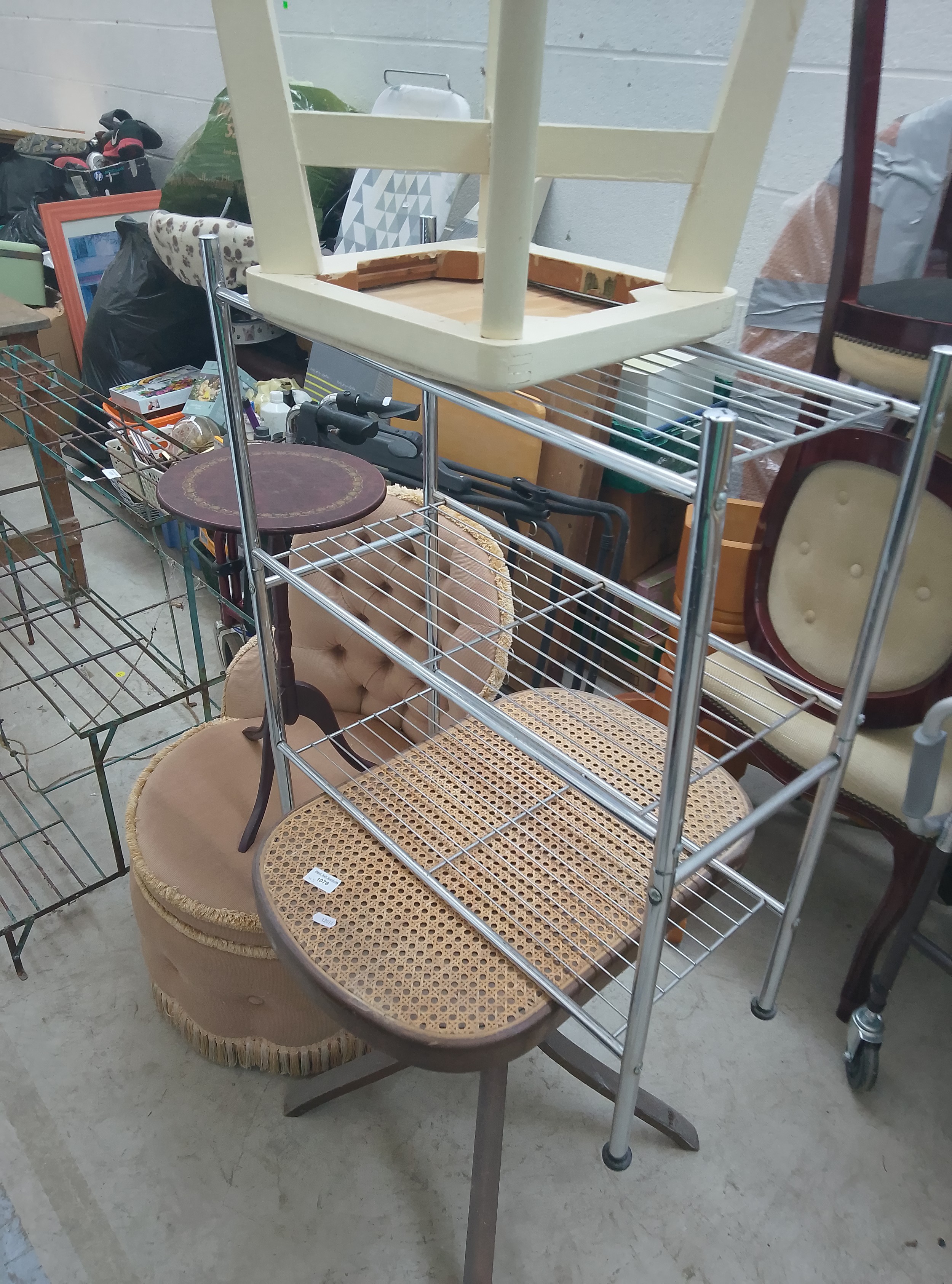 A multi-tiered metal shelving unit featuring a wooden chair, a decorative table, and upholstered stool.