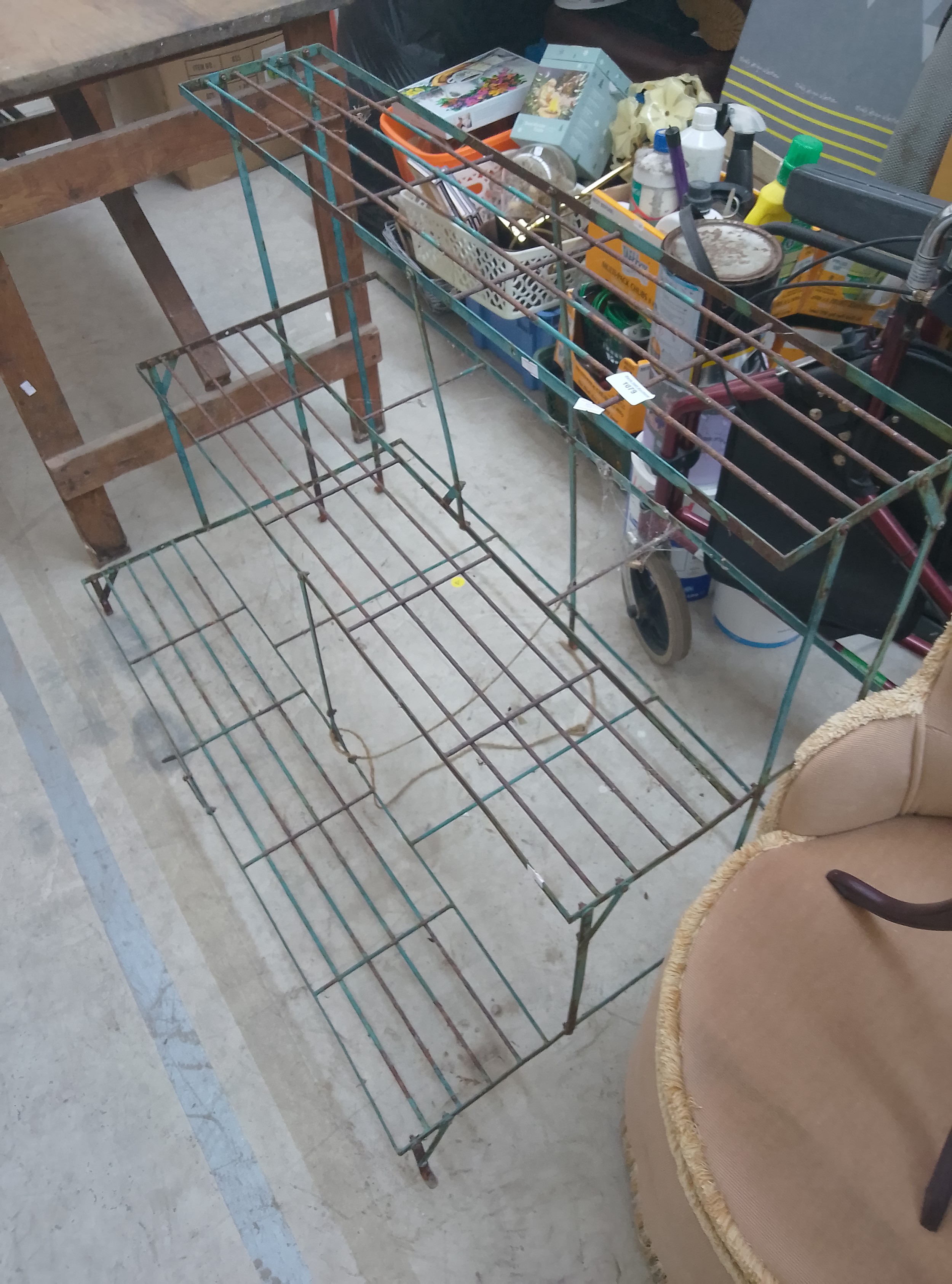 A tiered, green metal plant stand featuring wire grid shelves and a rectangular design with visible signs of rust and wear.