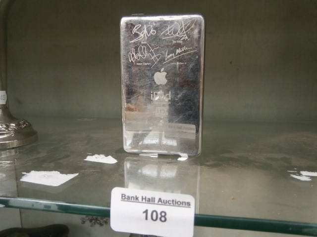 A signed Apple iPod featuring signatures from U2 members Adam Clayton, The Edge, and Larry Mullen Jr.