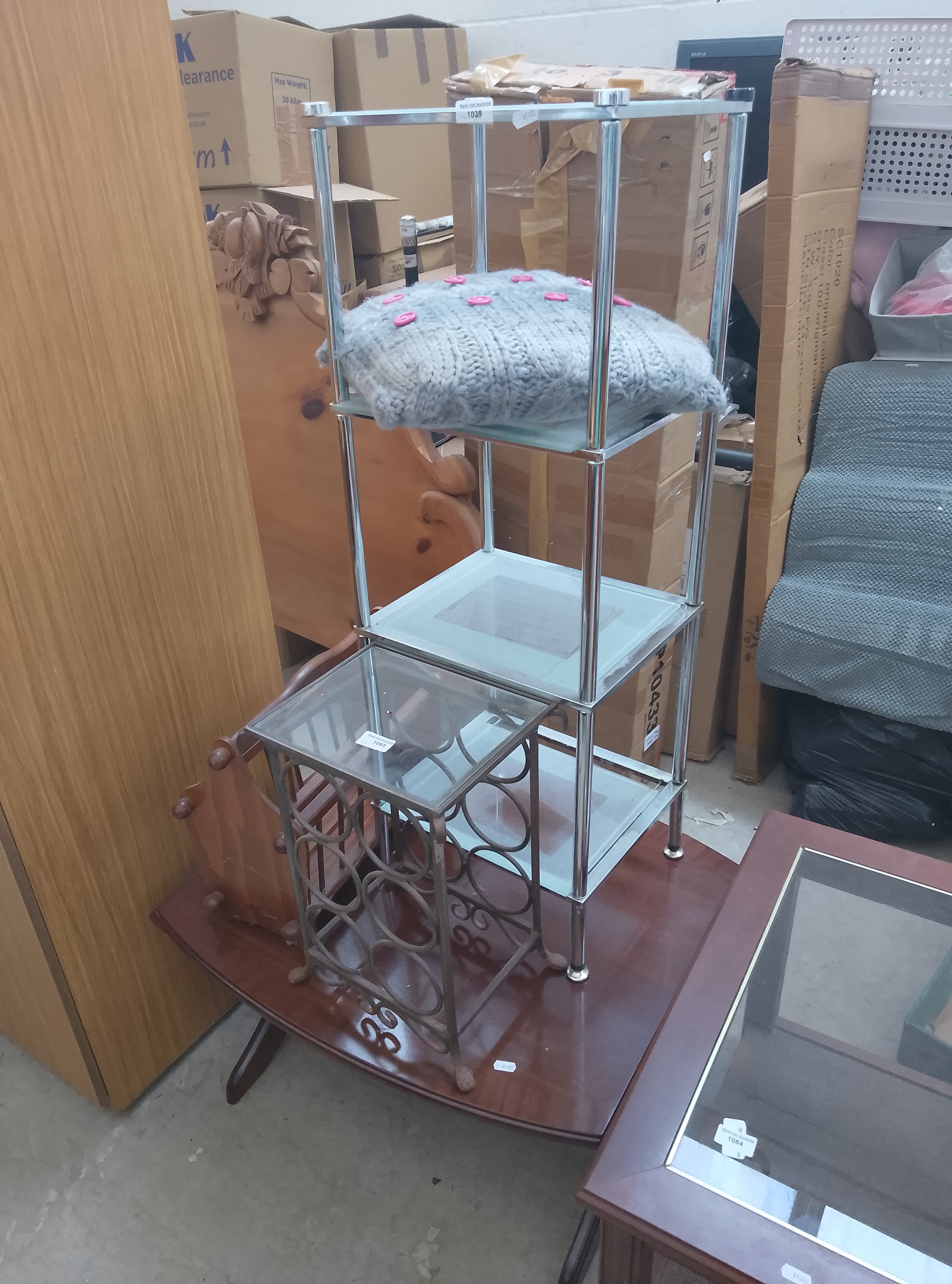 A chrome-framed, multi-tiered shelving unit with glass shelves, featuring a knitted item on the top shelf and a small glass-topped side table.