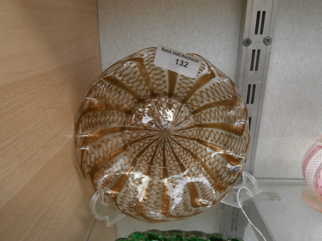 A clear, round glass object featuring a ribbed surface and interwoven gold-colored lines.