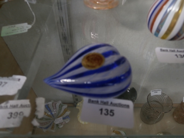 This is a glass teardrop-shaped object with white and blue swirls, featuring a circular gold-toned embellishment.