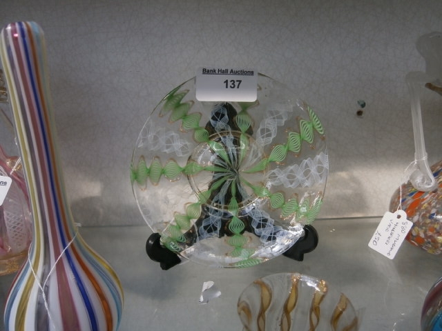 A clear glass dish with green, white, and gold wavy lines and a central starburst design, presented on a black stand.