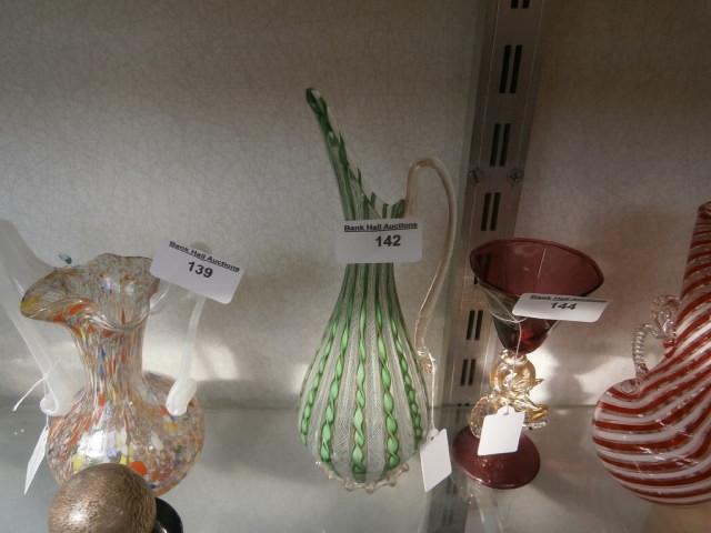 A clear glass pitcher featuring green wavy line decoration, a flared opening, and a slender spout.