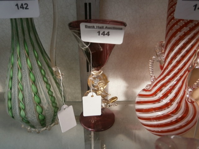 This is a red and white striped glass vase with two curled clear glass handles.