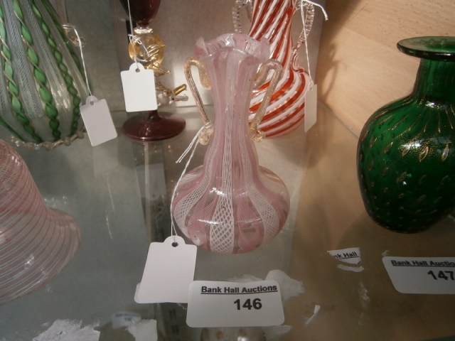 A pink and white striped glass vase featuring two applied handles and a ruffled rim, supported by a clear glass stem and base.