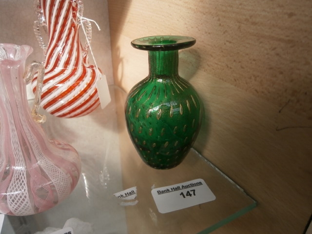A green glass vase with a flared rim, bulbous body, and textured surface featuring raised gold-colored oval markings.