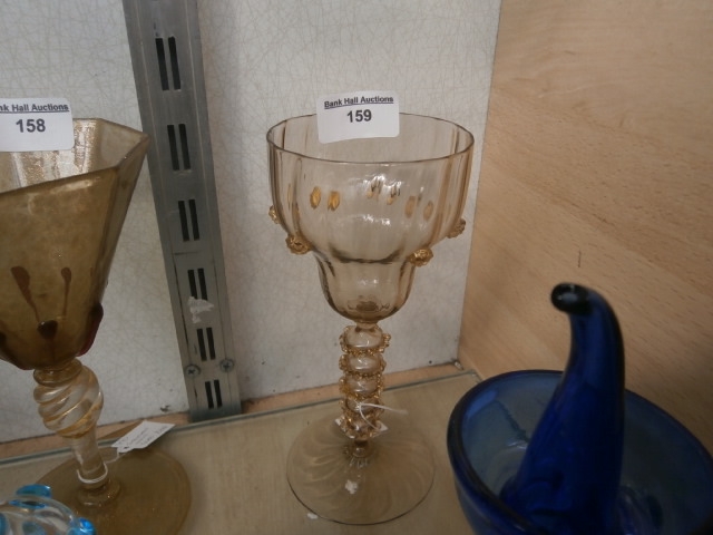 A clear glass goblet featuring a flared rim, bulbous bowl with applied gold dots, and a segmented stem with gold beads.