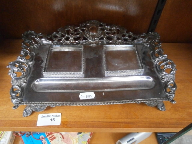 This is a silver-toned metal tray featuring ornate scrollwork, a central decorative crest, and two square indentations with an oval dish.