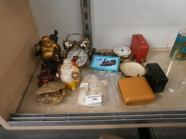 This lot features multiple decorative items including figurines, an alarm clock, various cases, a compact mirror, and a pencil sharpener.