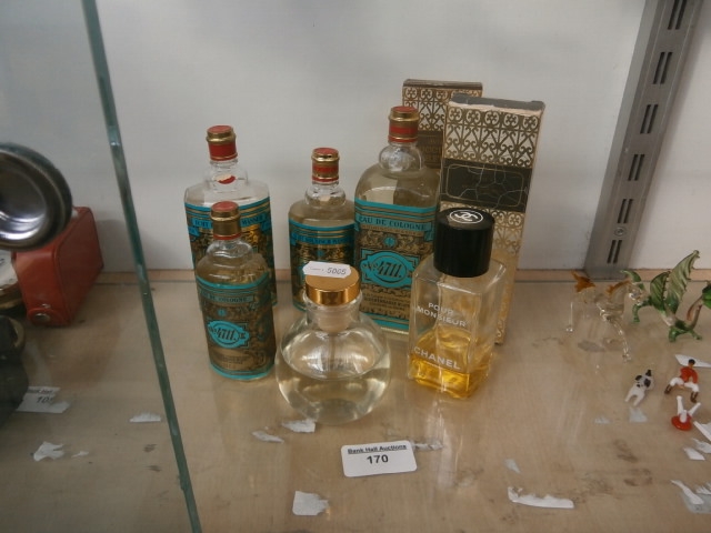 This lot features several perfume bottles, including “4711” and “CHANEL POUR MONSIEUR” examples, alongside decorative boxes and small figurines.