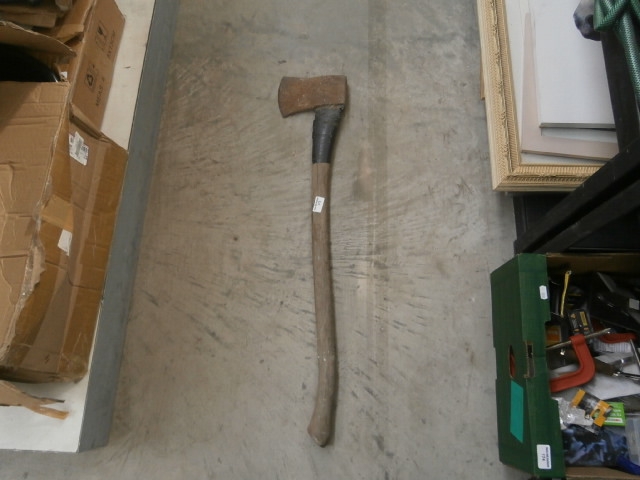 This is an axe with a trapezoidal, rusted metal head and a wooden handle wrapped in black tape.