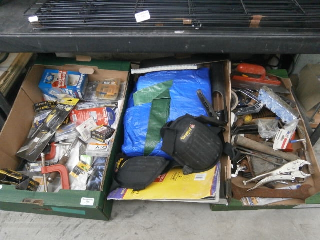 Three cardboard boxes containing a variety of tools, hardware, and a tool belt.