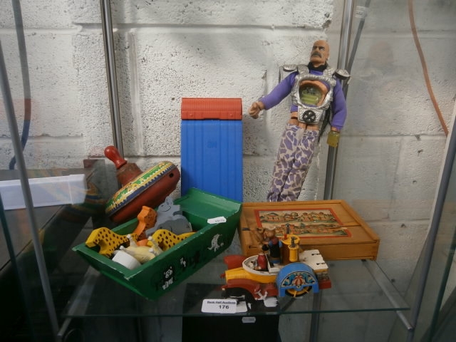 This lot features a collection of toys including a spinning top, wooden animal figures in a container, building blocks, a jointed action figure, a wooden box, and a toy vehicle.