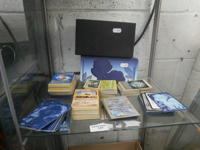 This lot features multiple stacks of trading cards alongside two cardboard boxes, one blue with creature illustration and a black box.