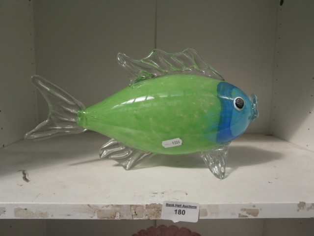 A translucent green glass fish figurine with blue head and clear fins.