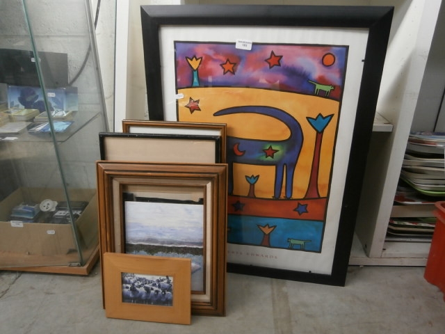 This lot features four framed pieces, including a large colorful print signed “EDWARDS” and a photograph of sheep.
