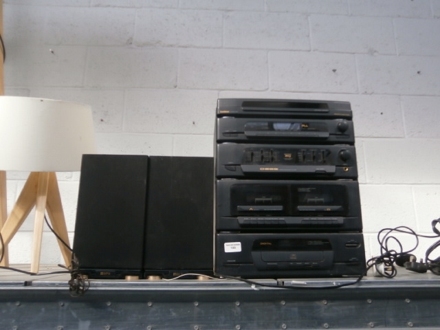 A black, four-component audio system with two speakers, featuring cassette decks and digital input.