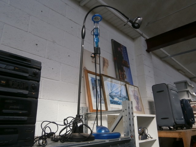 This is a black floor lamp featuring a flexible gooseneck arm and a silver lamp head, supported by a round blue base.