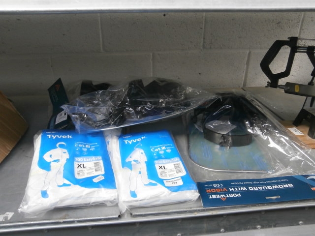 This lot contains two Tyvek protective coveralls and a Portwest Browguard with visor.