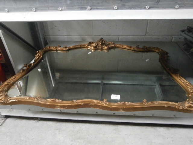 A large, ornate mirror with a gold-colored frame featuring scrolling and floral motifs.