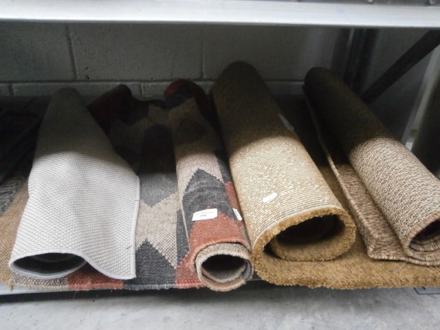 This collection features five rolled rugs, with varying geometric patterns and solid textured weaves in neutral tones.