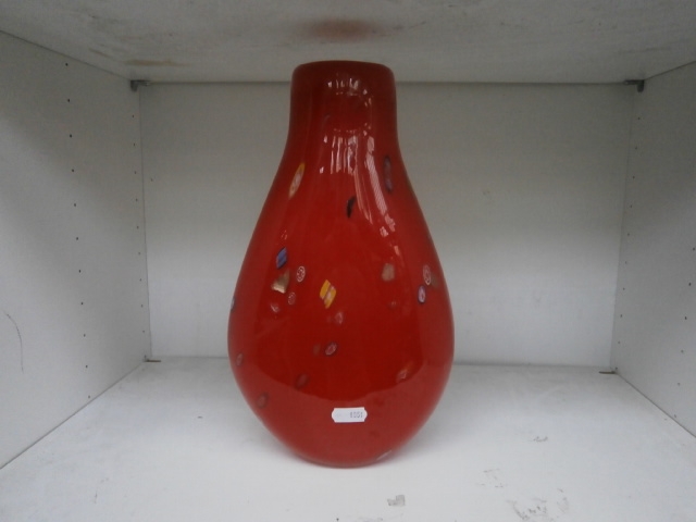 A red glass vase with a teardrop shape, featuring embedded colored glass fragments and a white sticker.