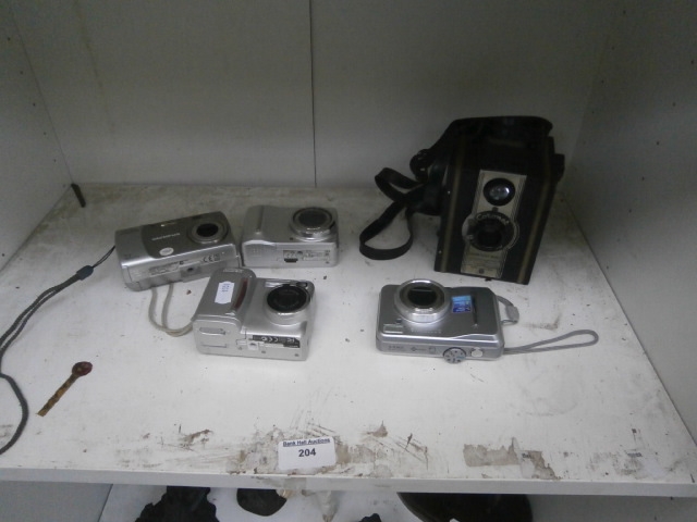 This lot features three silver compact digital cameras, one with Olympus branding, and a vintage-style brown and black camera, along with a camera bag.