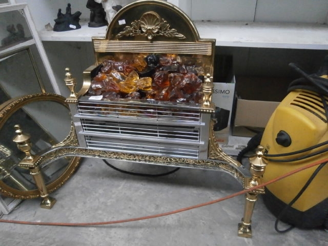 This is a decorative electric fireplace with a metal frame featuring scrollwork and amber glass embers.