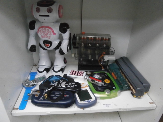 A collection of electronic toys and accessories including a robot, engine model, watch, handheld devices, and train cars.