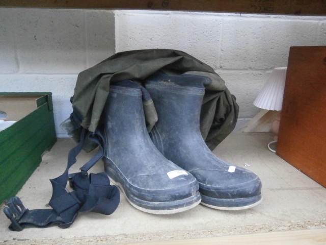 A pair of knee-high dark blue rubber boots with black straps and buckles, featuring white labels and ribbed soles.