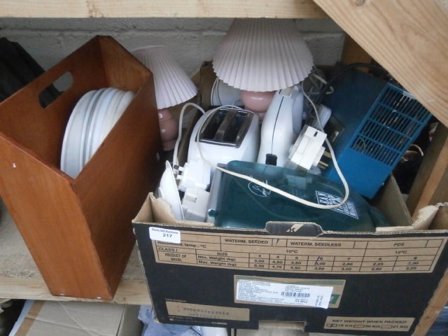 A V-shaped wooden crate containing white plates is presented alongside a cardboard box filled with various appliances including a blue heater, a green appliance, a white toaster, a mixer, and lamps.