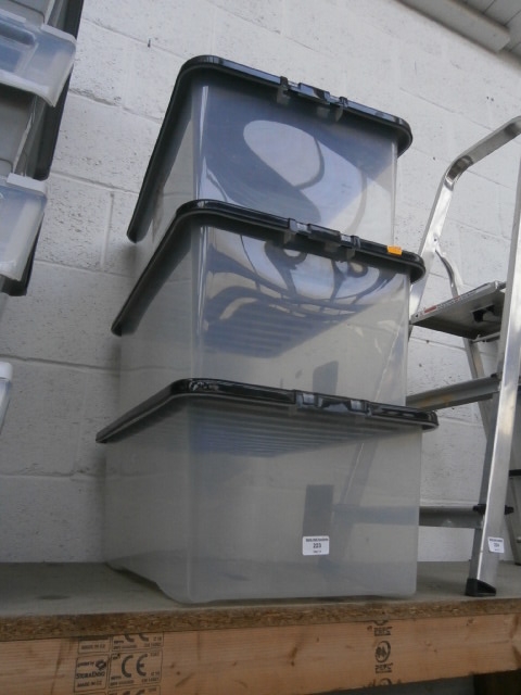 Three stacked clear plastic storage bins with black lids and latches.