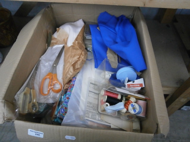 A collection of sewing essentials including scissors, multiple spools of thread, fabric, and a plastic container.