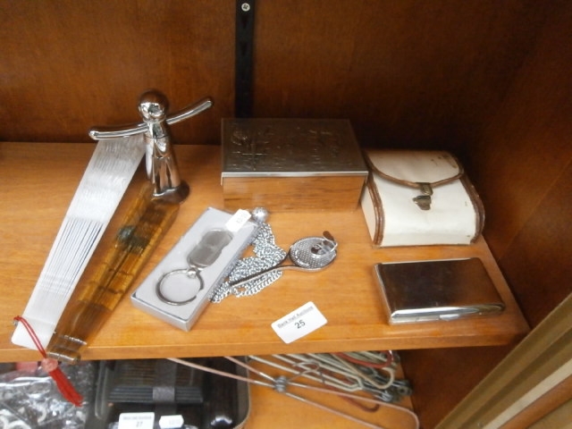 A collection of accessories including a fan with a tassel, a decorative box, a pouch, a cigarette case, and a keychain in a box.