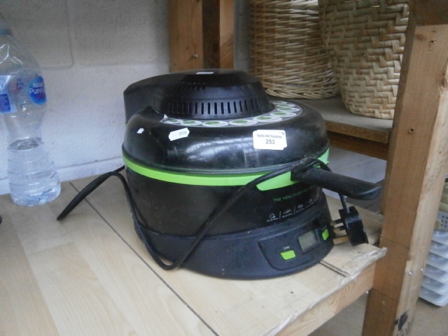 This is a black and green air fryer with a domed top, digital display, and green accents.