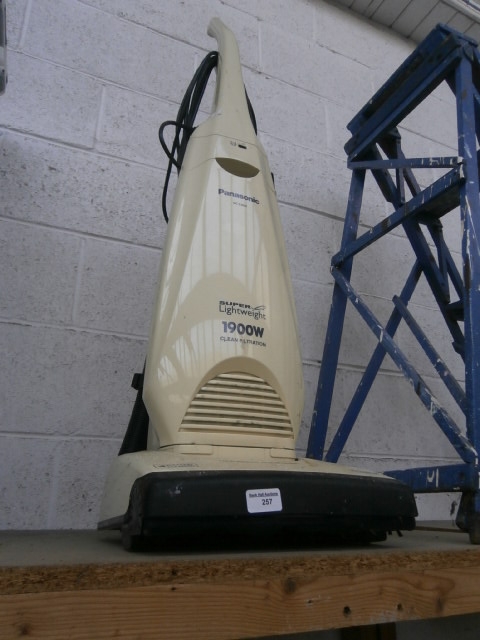 A cream-colored Panasonic upright vacuum cleaner with a black base and “SUPER Lightweight 1900W CLEAN FILTRATION” text.