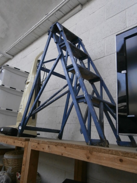 This is a blue A-frame stepladder with four wooden steps and a metal frame.