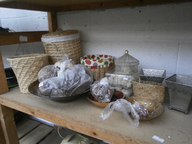 This lot features several woven baskets, metal planters, a decorative bowl, a glass cloche, and various bagged decorative fillers.