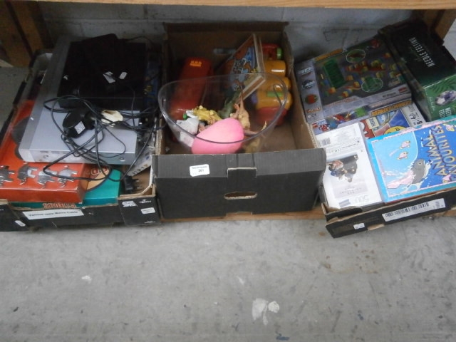 This lot contains a silver-colored electronic device, a collection of toy figures in a bowl, a construction set, and a book titled “ANIMAL FAVOURITES”.